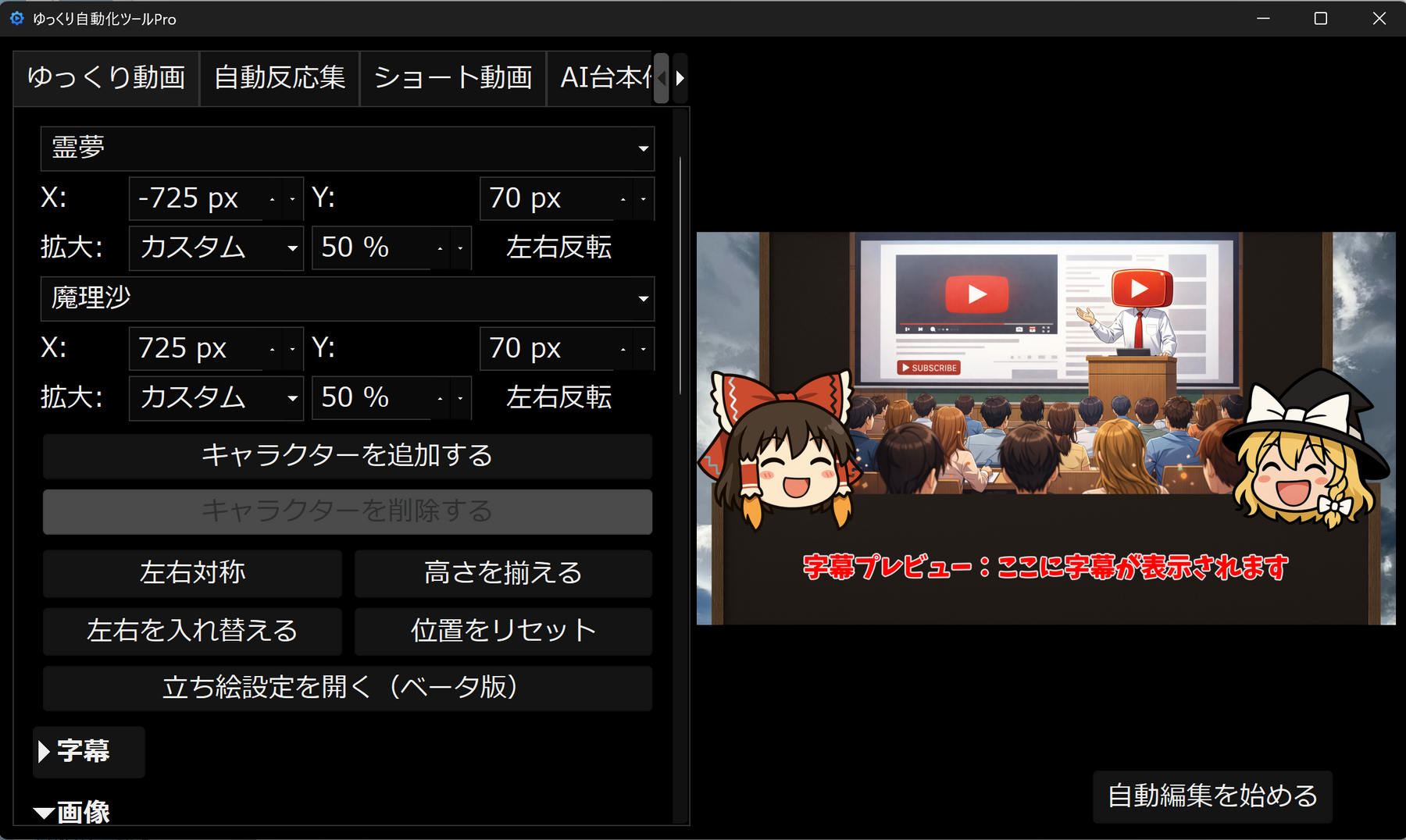 台本を読み込むだけで、フリー画像を自動収集し、立ち絵・字幕・音声アイテムをタイムラインに一気に配置します。